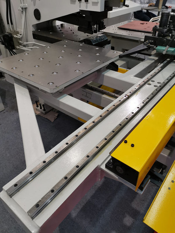 1. The machine-frame is made by C-type plate welding, with good rigidity and big handling space. The machine sets three die-stations (among them, one is the marking die-station), automatic switching die-stations. Clamping system can adapt to different work piece, with zero baffles as datum mark, and work piece supported by rolling-ball working table. Axis X & Y action should be controlled by servo motor and ball-screw driving, and double-axis CNC system controls the position of punching, so as to make the whole machining process automatically; operator may input the sizes of work piece to computer for repeated calling program in the future.